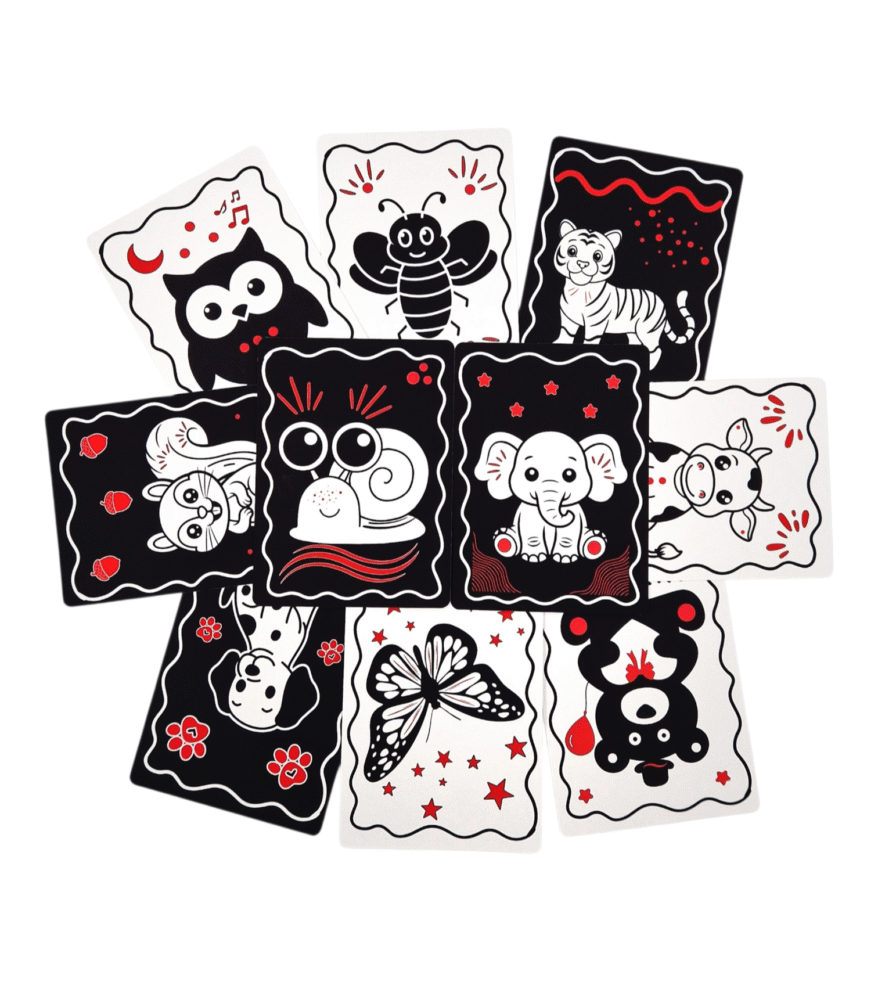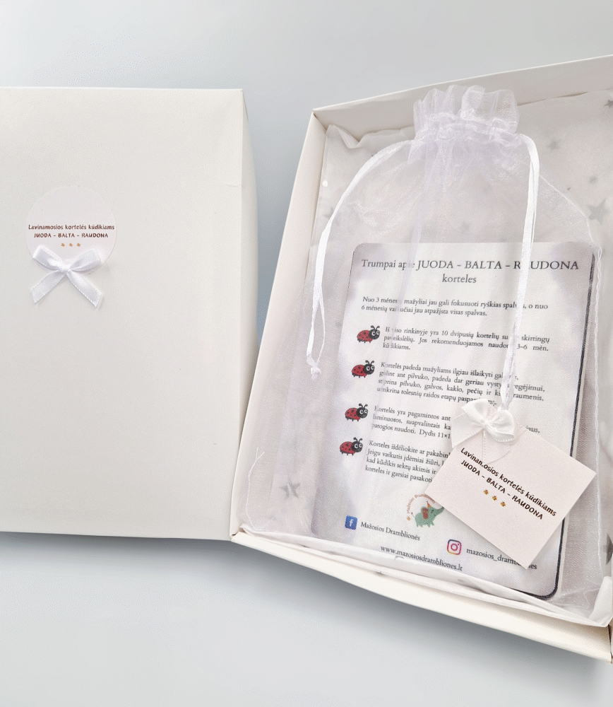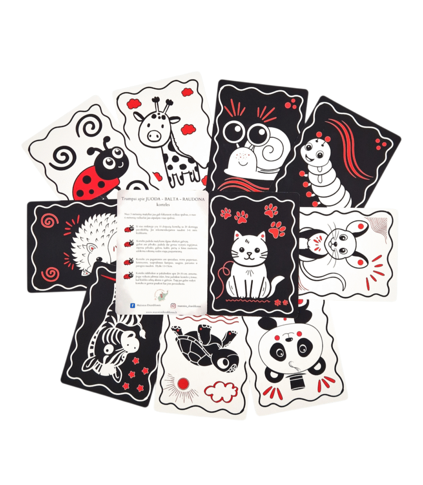 Žaismingos, dėmesį pritraukiančios ir itin veiksmingos JUODA – BALTA – RAUDONA kortelės – tai žingsnis į pasaulio pažinimą Jūsų vaikučiui.